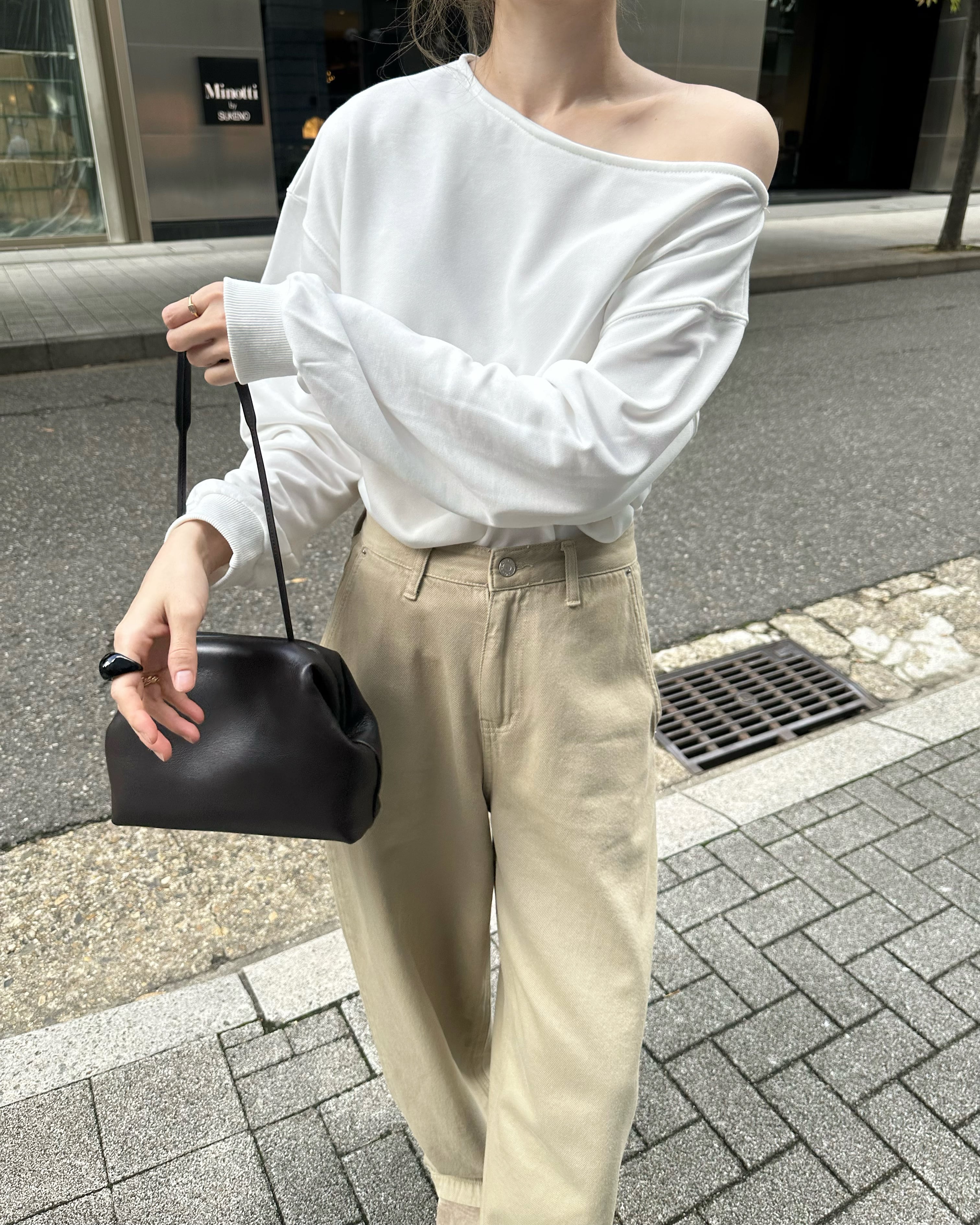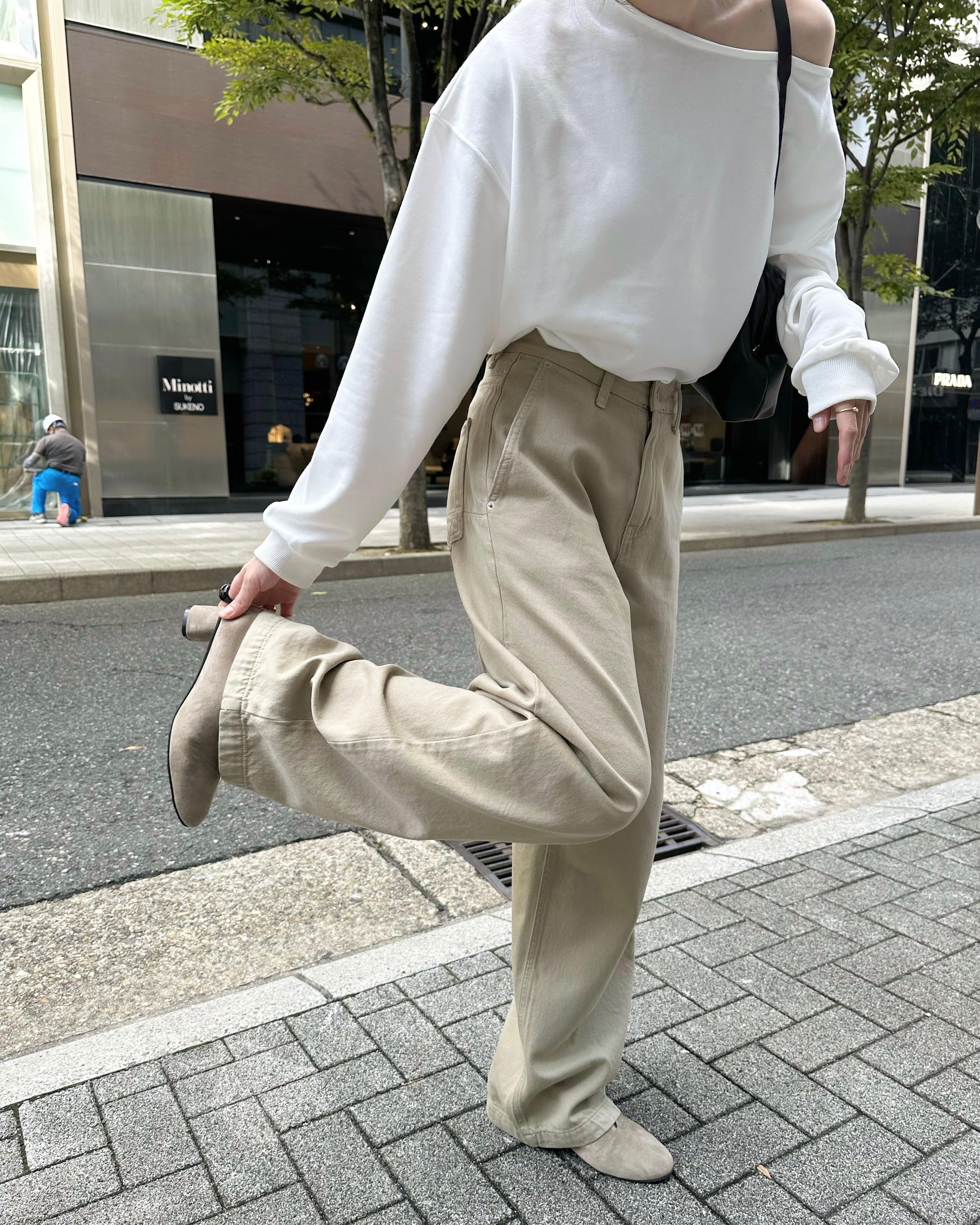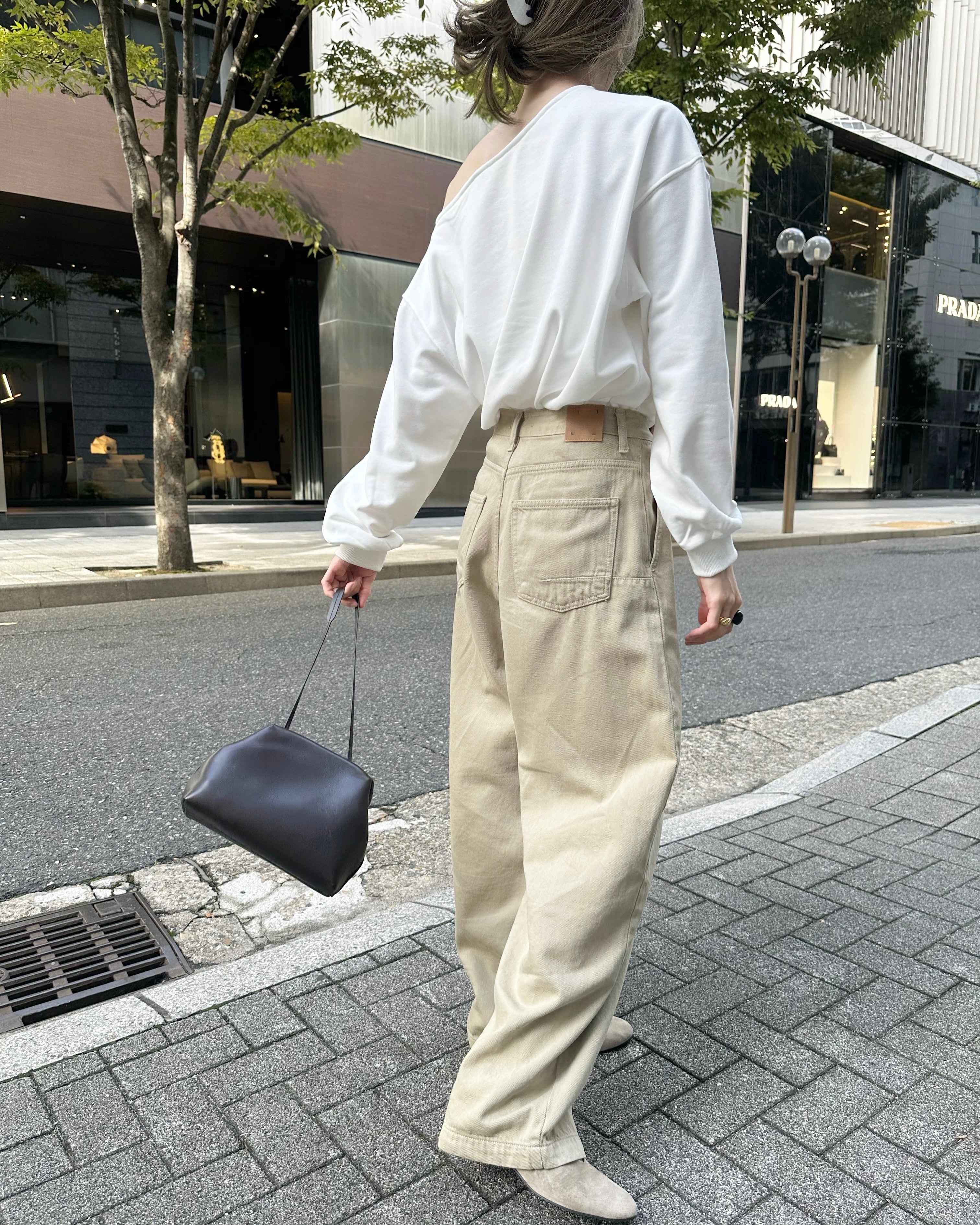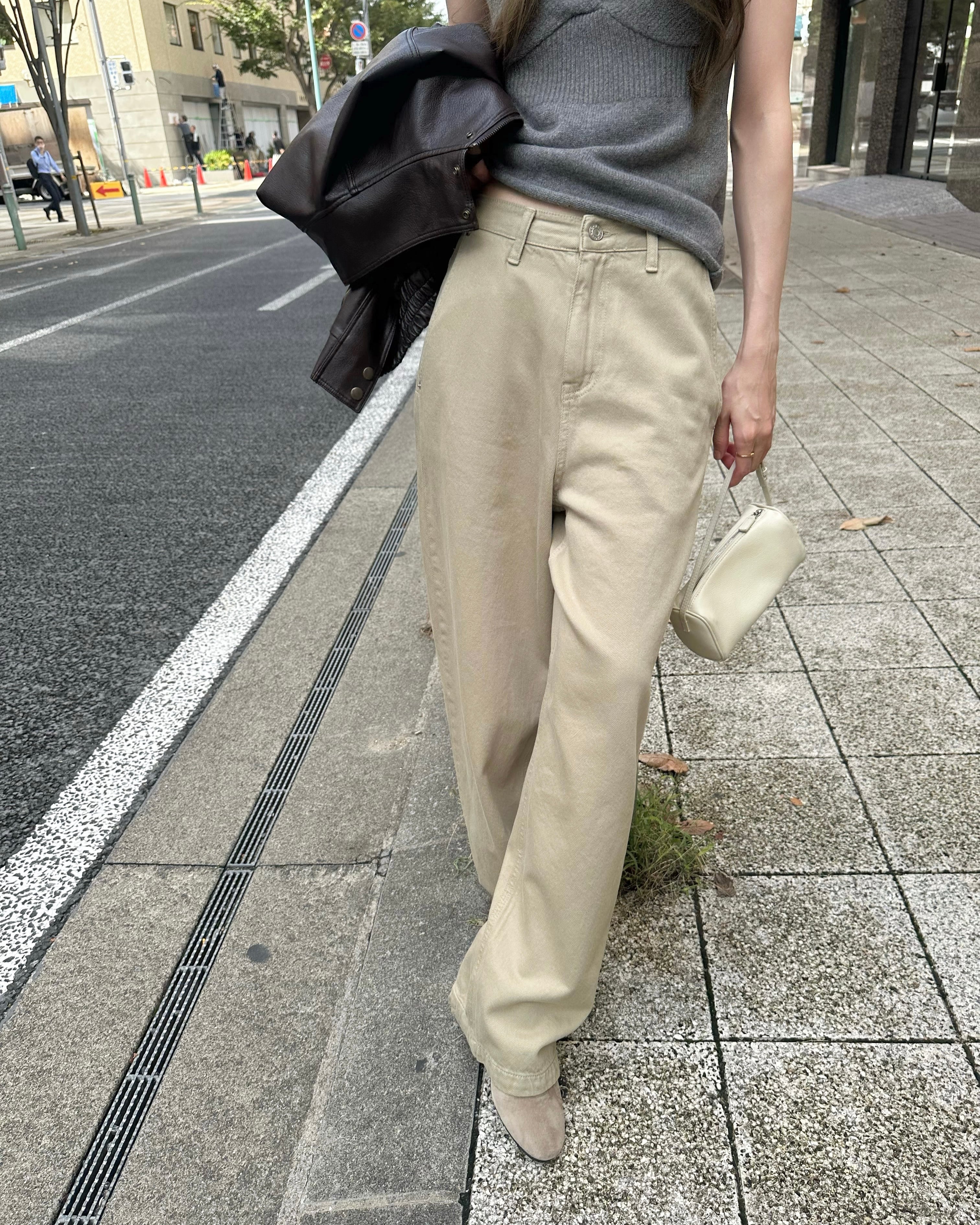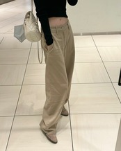 旬のスタイリングが完成するベージュパンツ。ハイウエストとワイドで長いレッグが特徴のジーンズです。