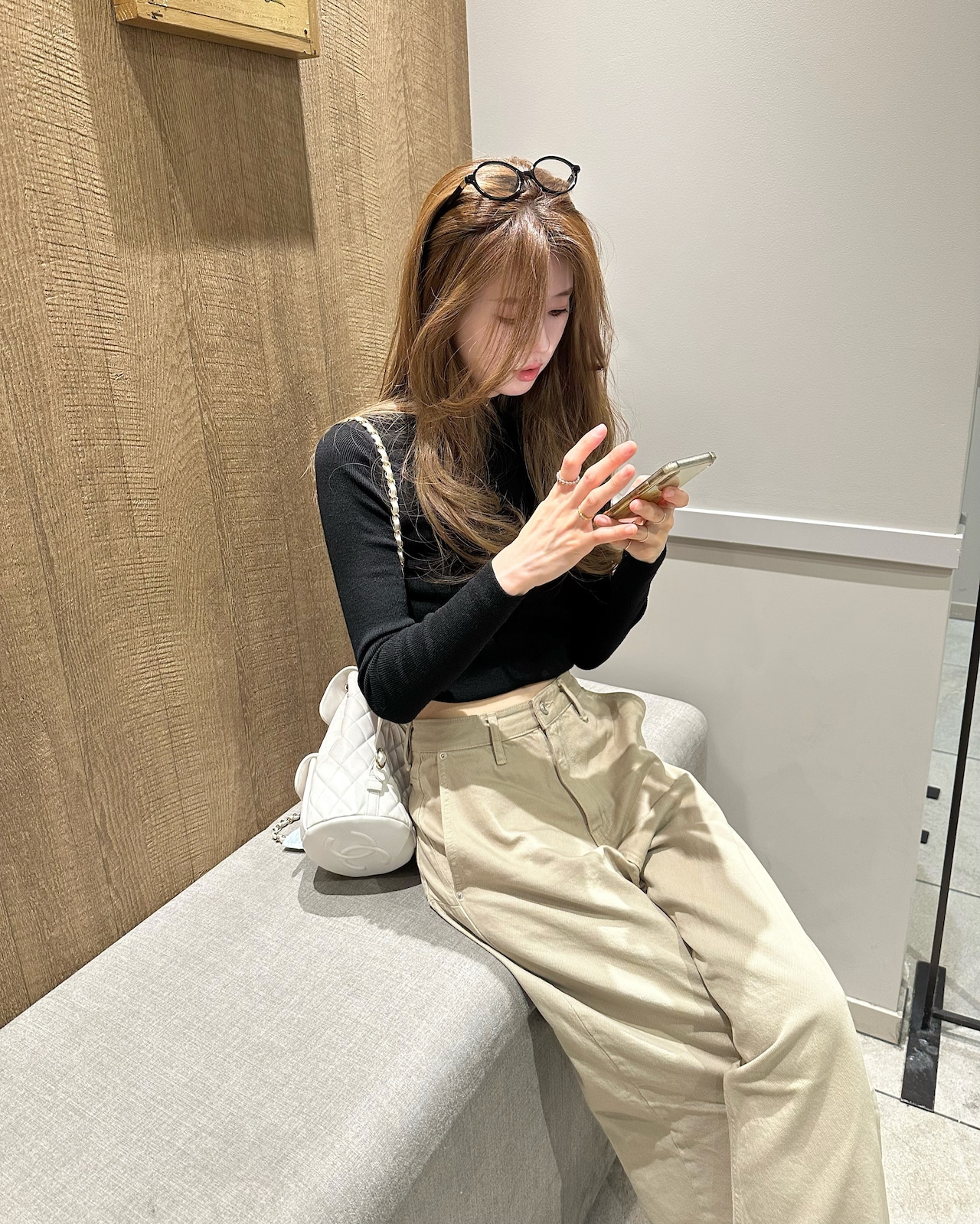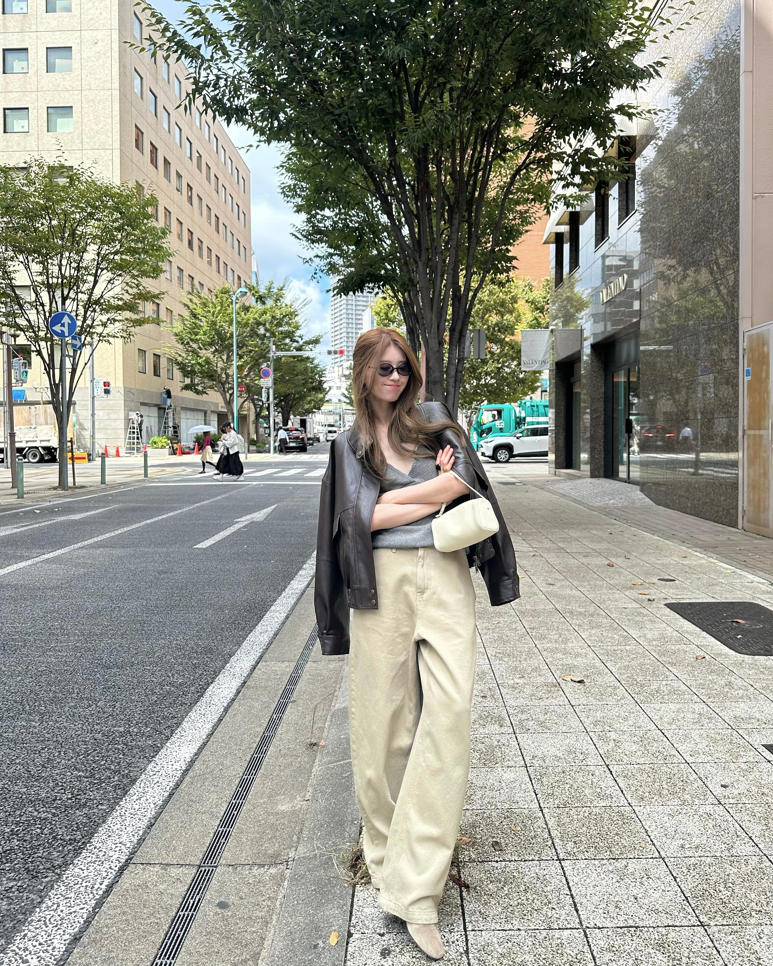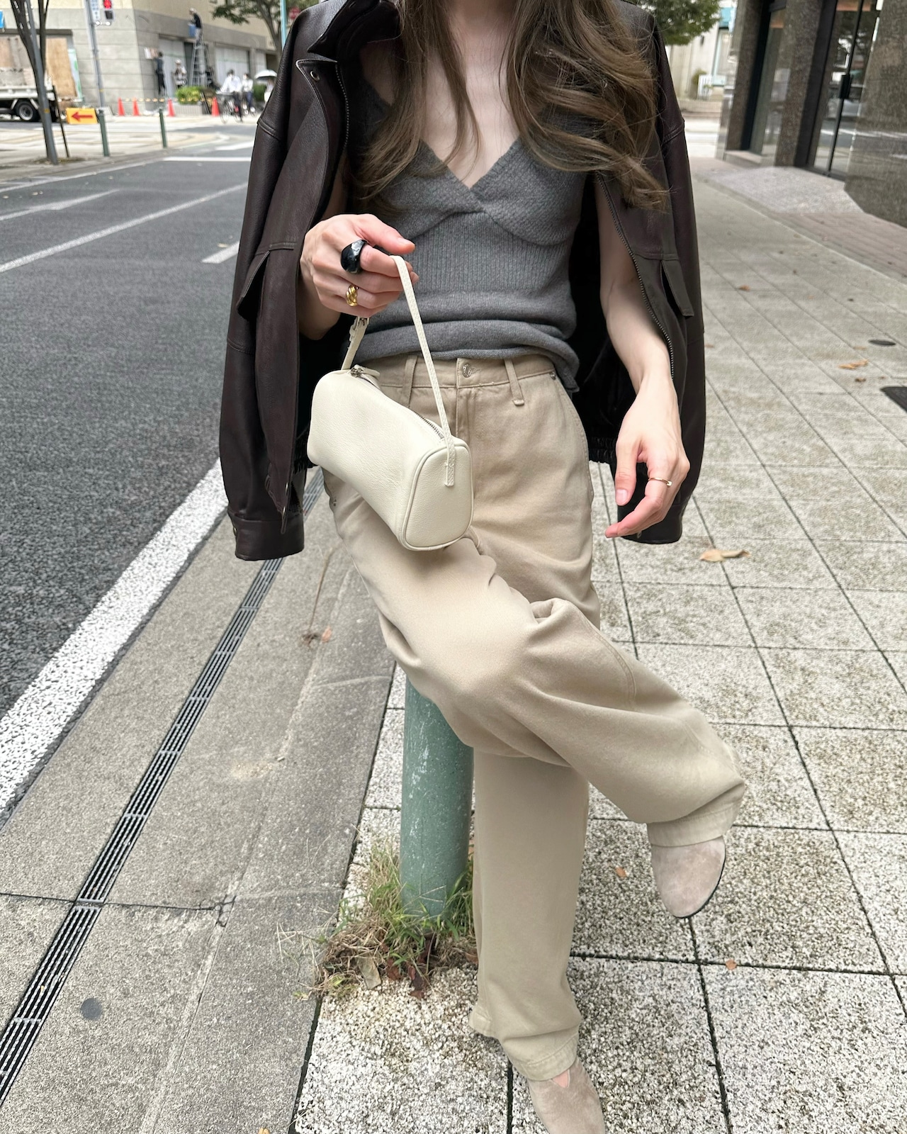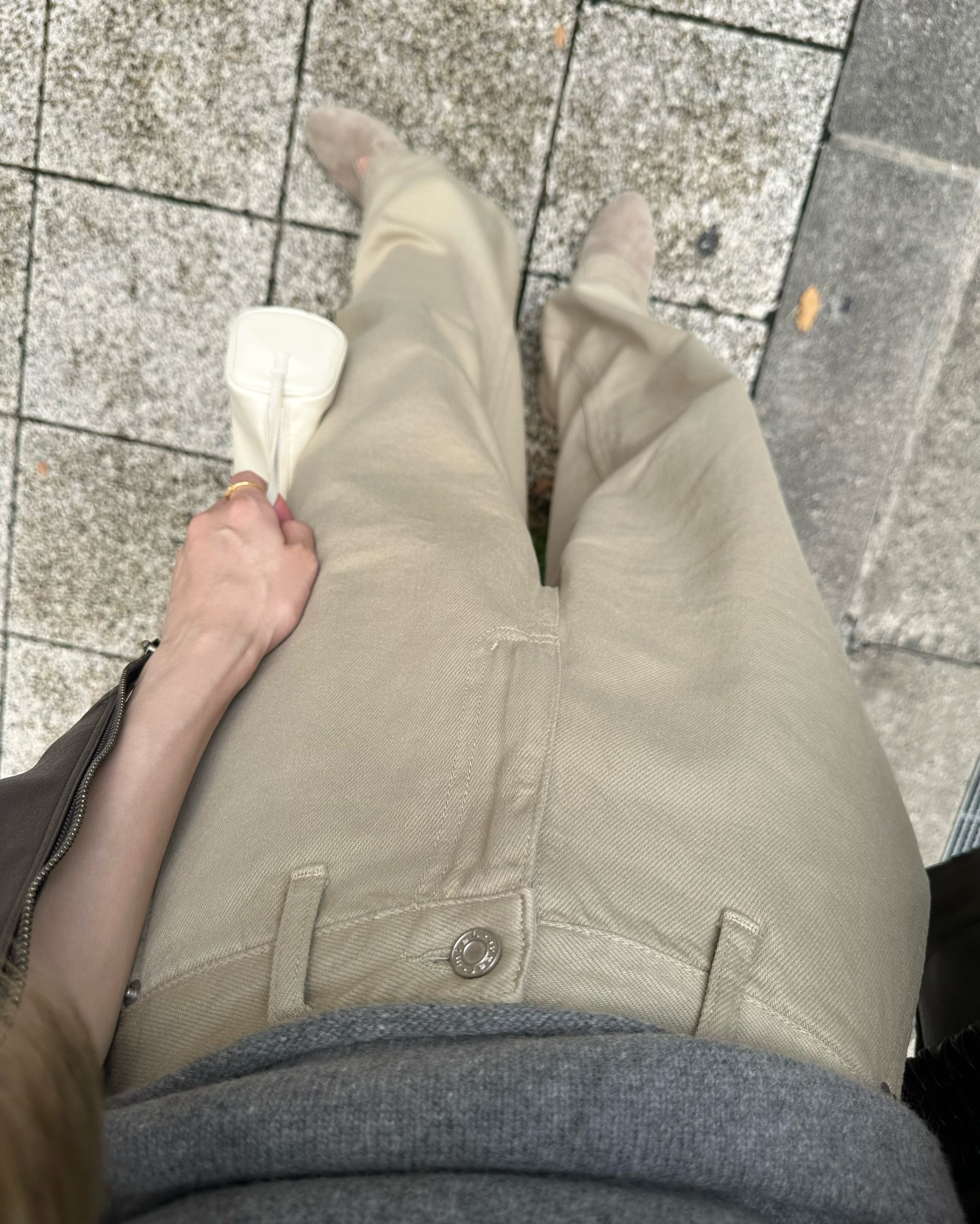 旬のスタイリングが完成するベージュパンツ。ハイウエストとワイドで長いレッグが特徴のジーンズです。