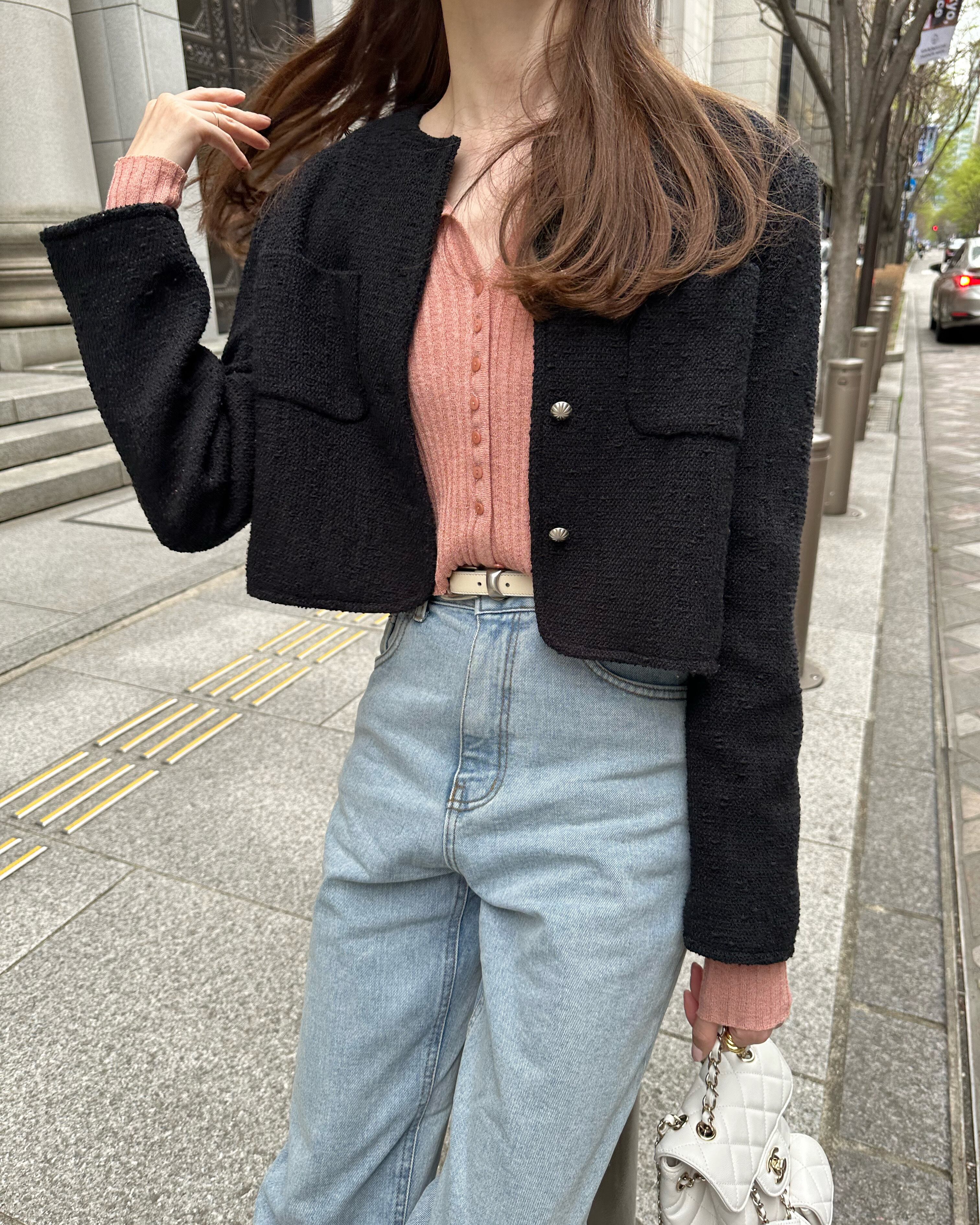 ボタンは同色に染めたシェルボタンで上品に。