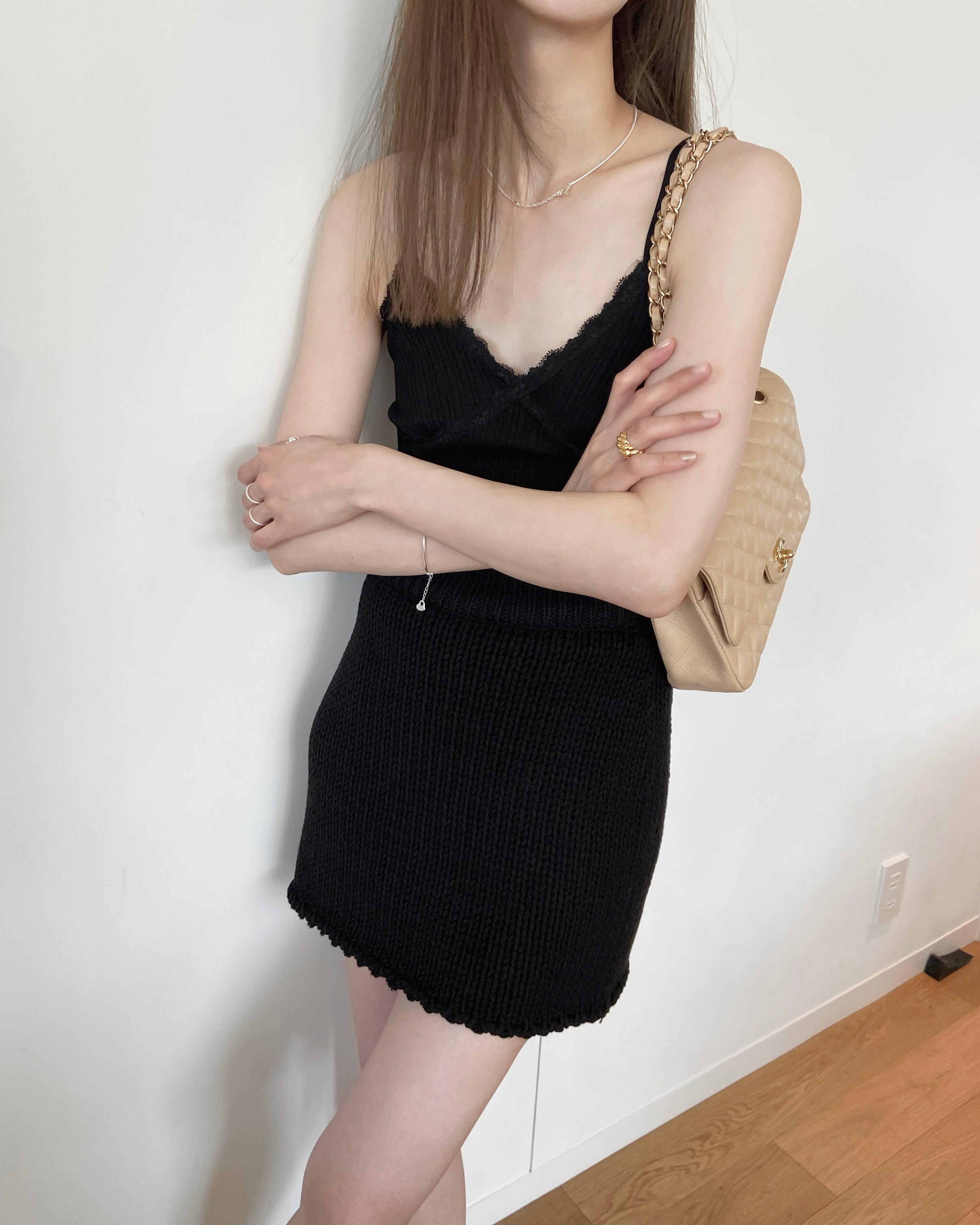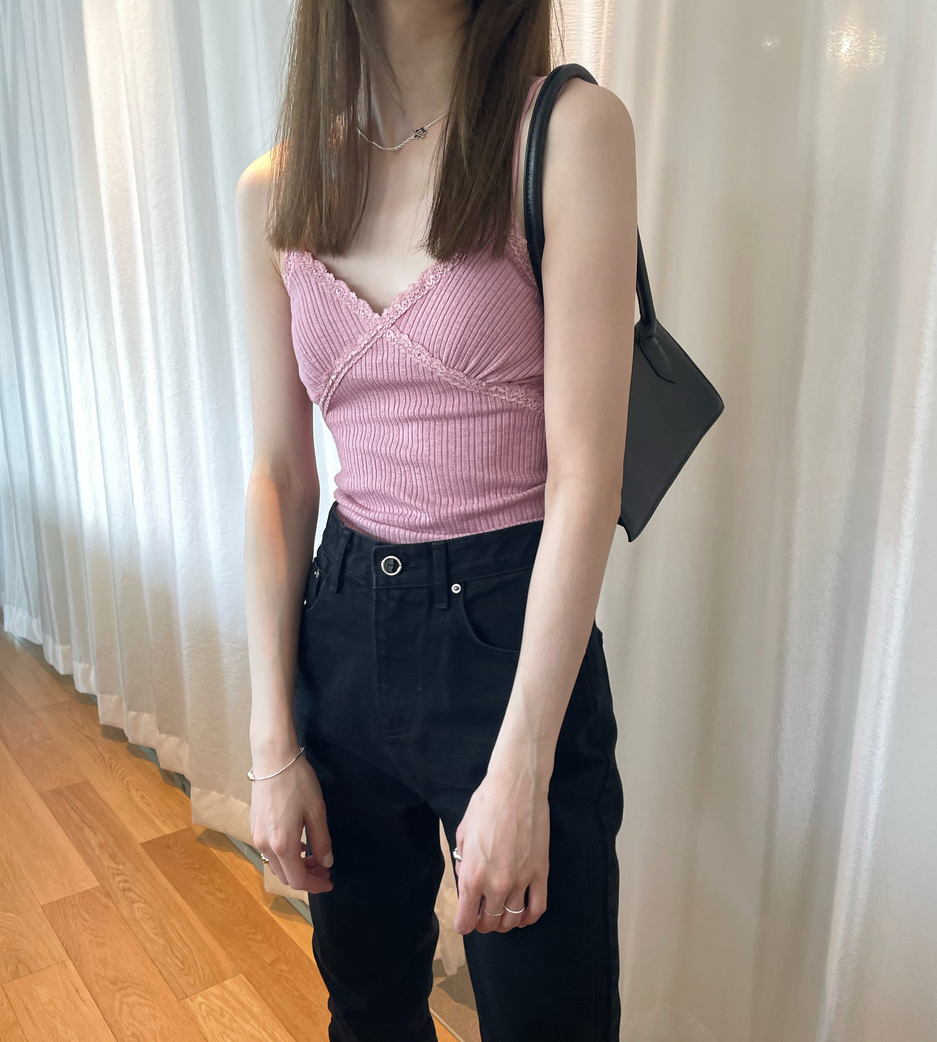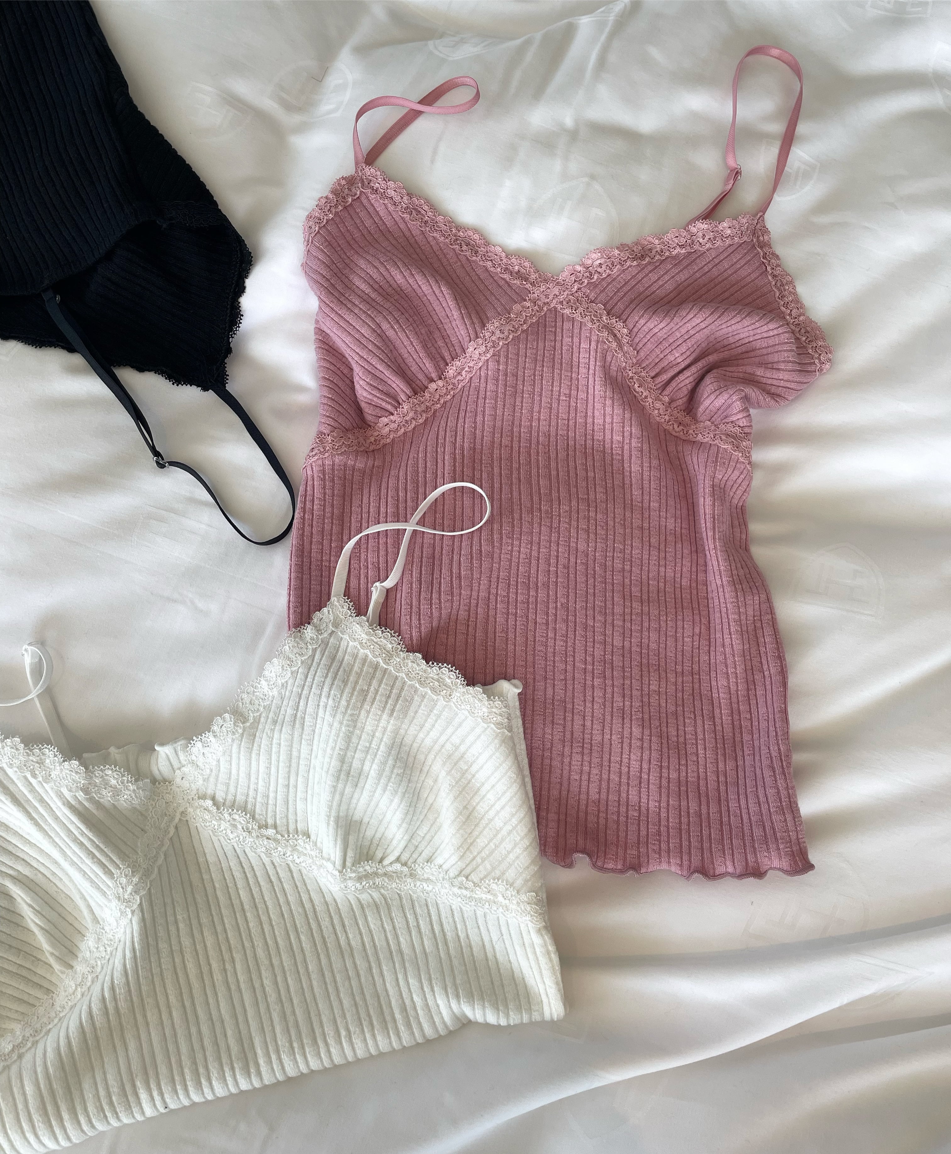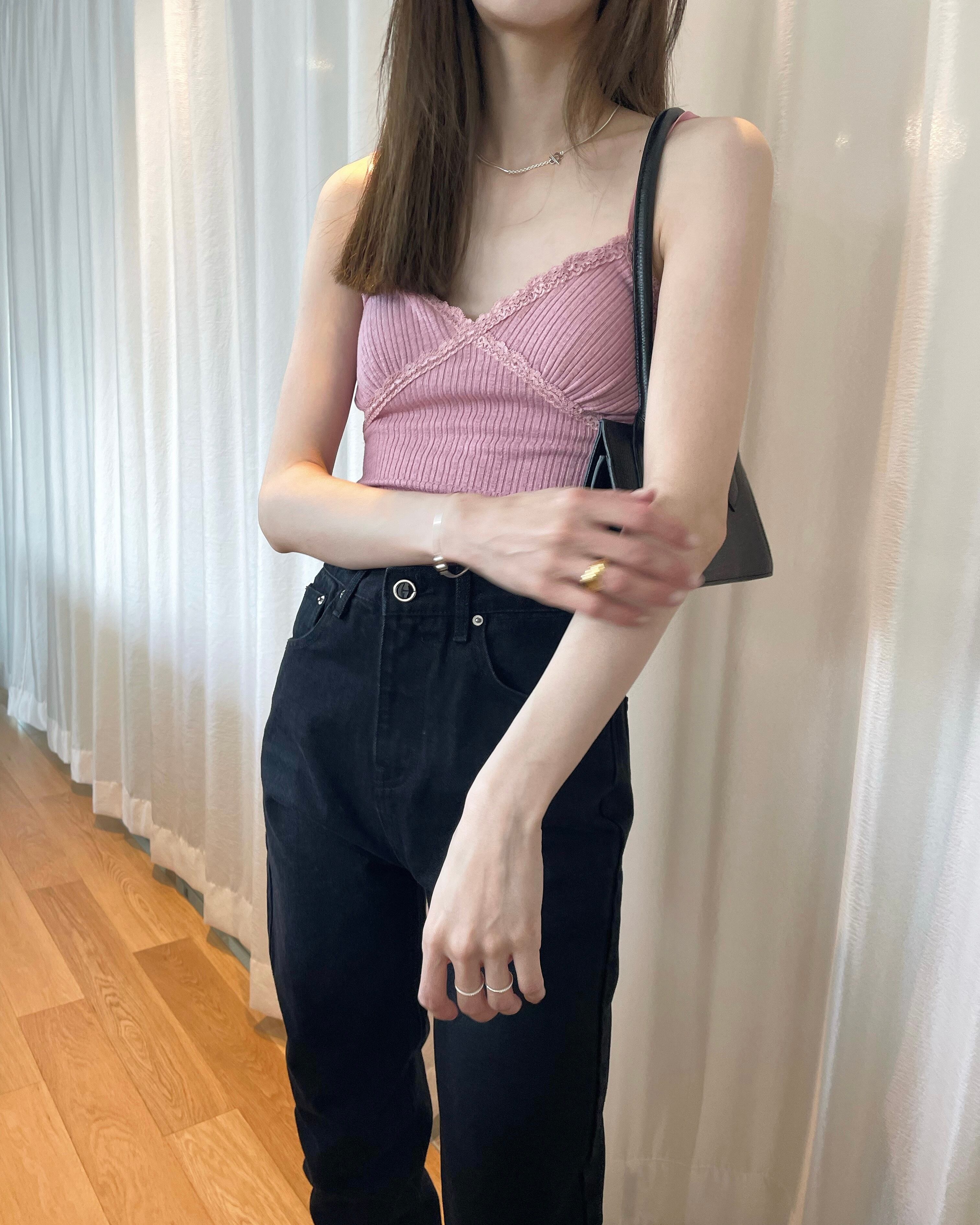 デコルテ部にあしらわれたレースや華奢なツヤっとストラップ、リブデザインなど可愛らいポイントが詰まった一枚。