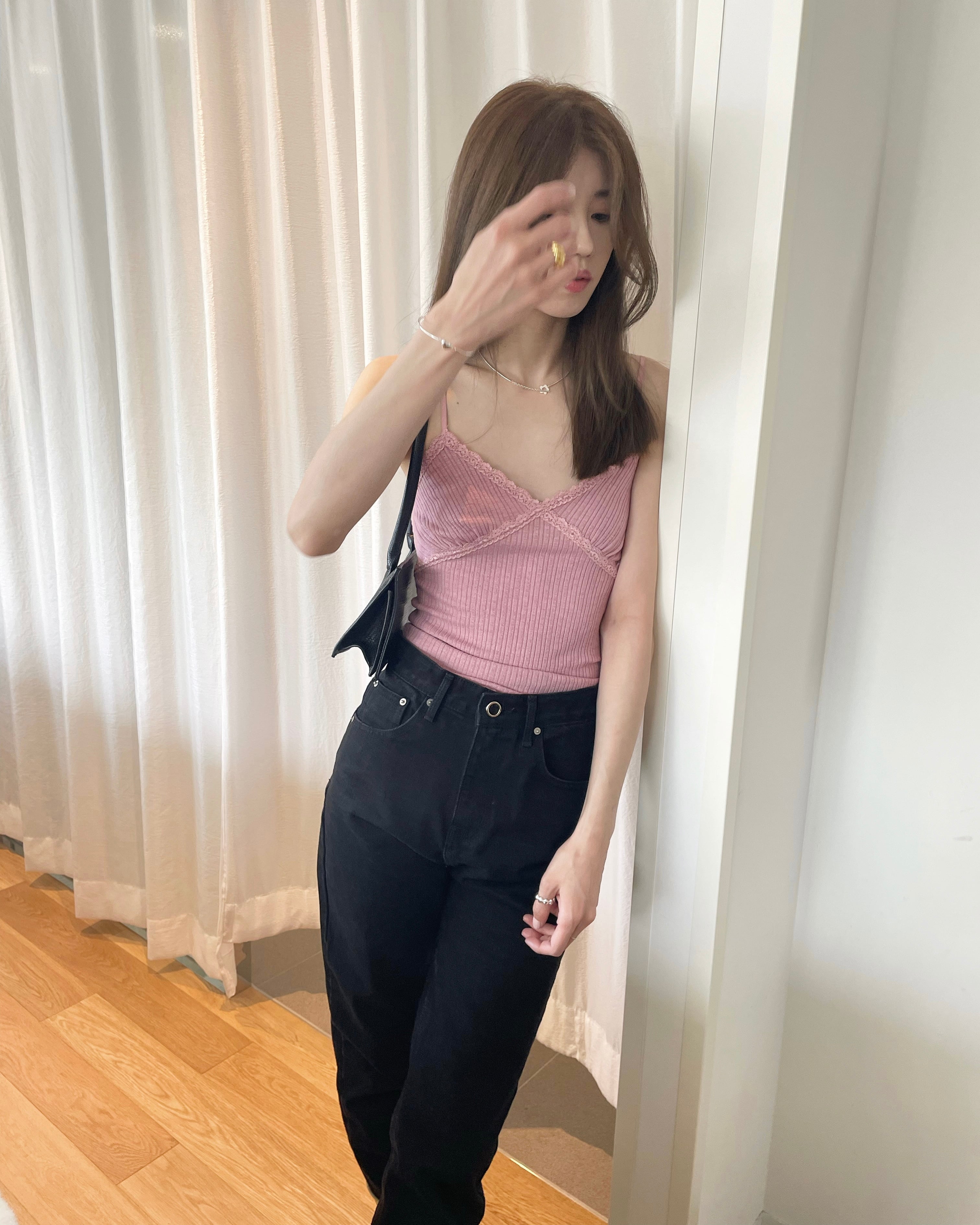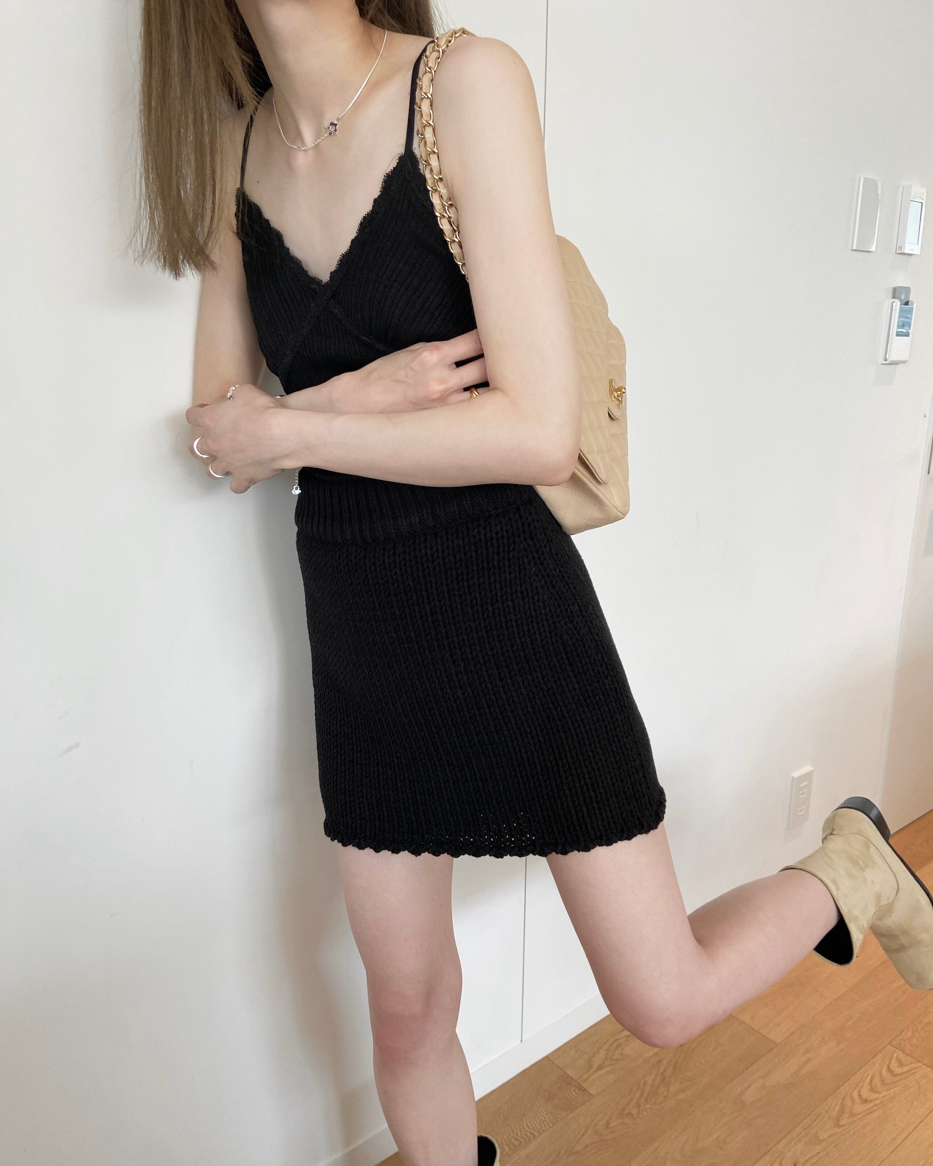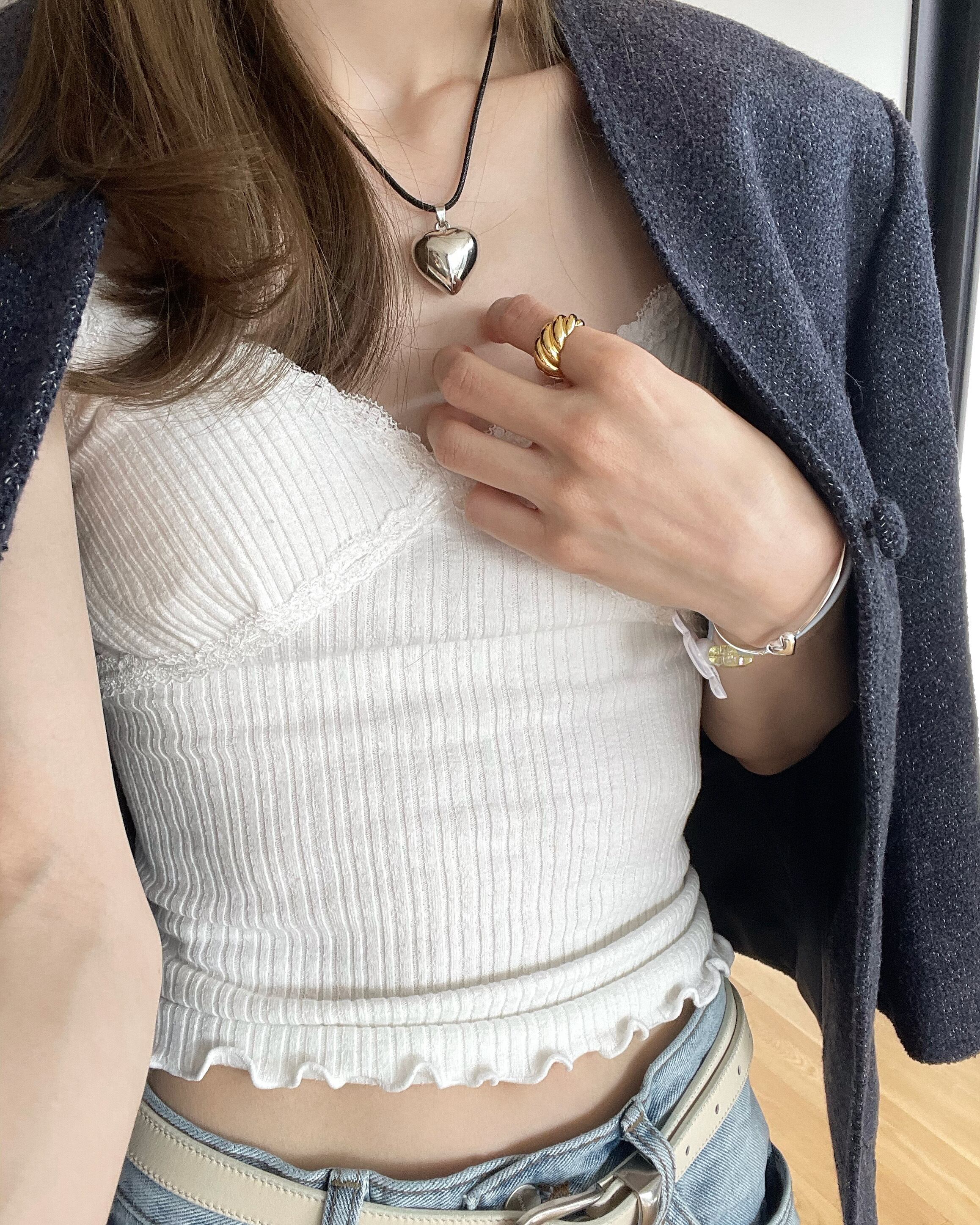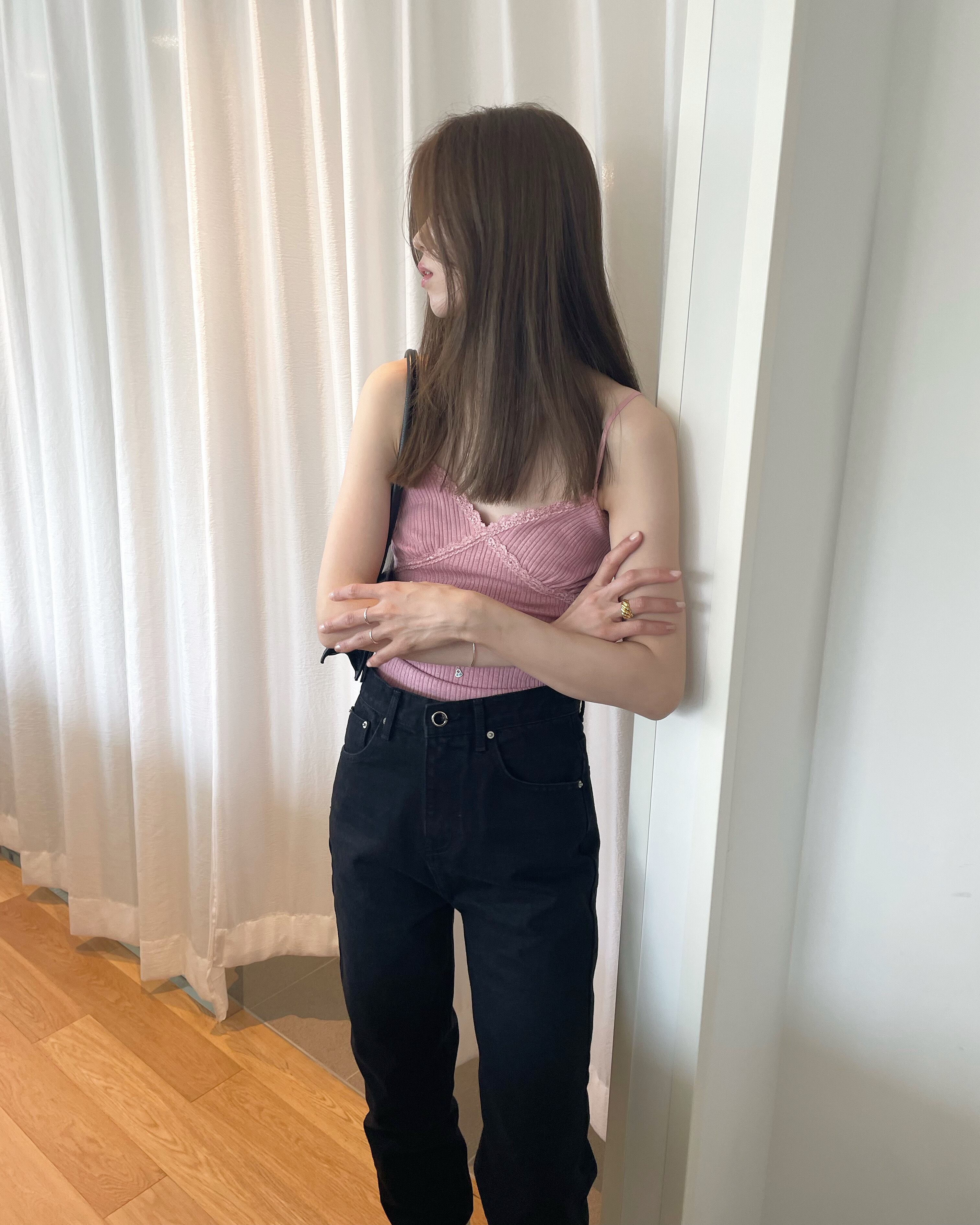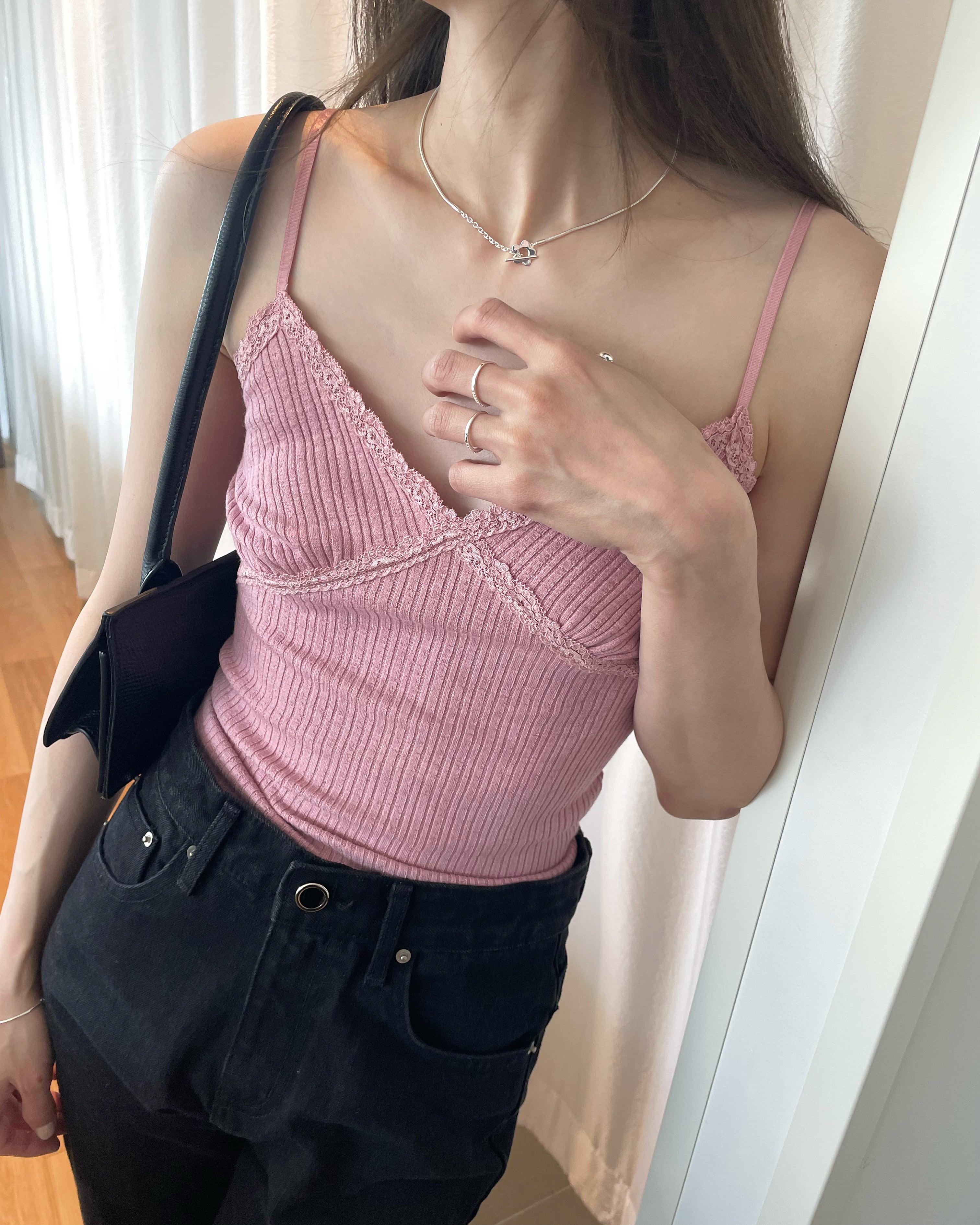 デコルテ部にあしらわれたレースや華奢なツヤっとストラップ、リブデザインなど可愛らいポイントが詰まった一枚。